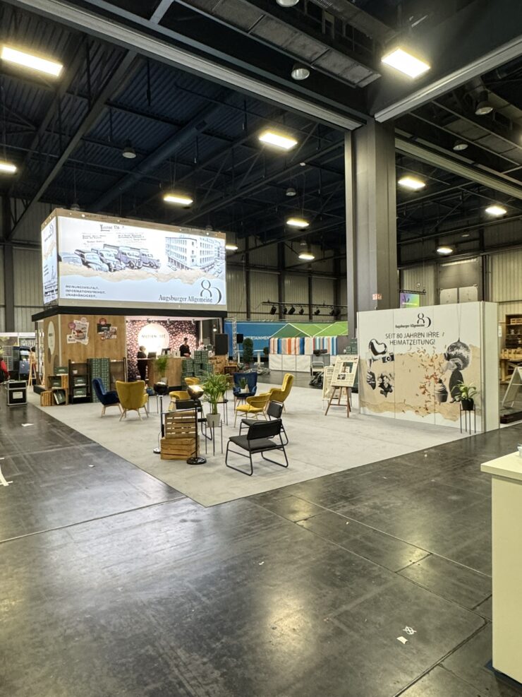 Für die renommierte Regionalzeitung Augsburger Allgemeine wurde auf der A/FAIR 2025 ein moderner und einladender Messestand realisiert. Zum Einsatz kam das hochwertige Aluvision Flexbox-System, das maximale Flexibilität in der Gestaltung und eine klare, zeitgemäße Präsentation der Marke ermöglichte.