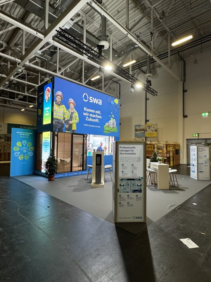 Die großformatige LED-Wand diente als aufmerksamkeitsstarkes Element und vermittelte die Botschaft der SWA unter dem Motto: „Komm mit, wir machen Zukunft.“ Ergänzend wurden mehrere Info-Stelen platziert, die gezielt über professionelle Energielösungen und smarte Services für Immobilienbesitzer informierten.