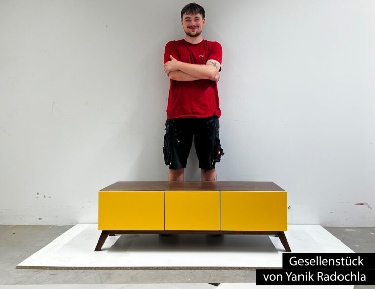 Am 03.07.2025 präsentierte unser Auszubildender Yanik Radochla im Rahmen seiner Gesellenprüfung ein eigenständig entworfenes Möbelstück: ein charakterstarkes Lowboard im Stil der 1980er-Jahre, kombiniert mit moderner Formensprache und handwerklicher Präzision.