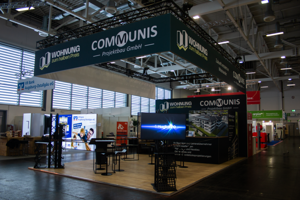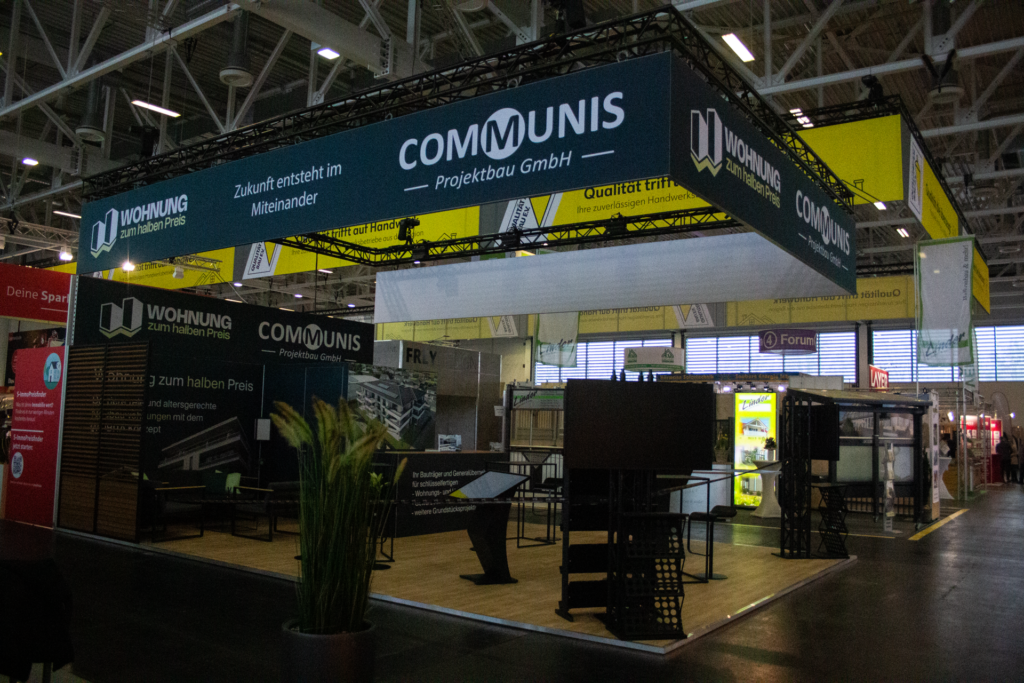 Für Communis Projektbau durften wir einen großzügigen Kopfstand mit 9 × 6 Metern Fläche realisieren – offen auf drei Seiten und klar auf Kommunikation, Präsentation und Aufenthaltsqualität ausgelegt.